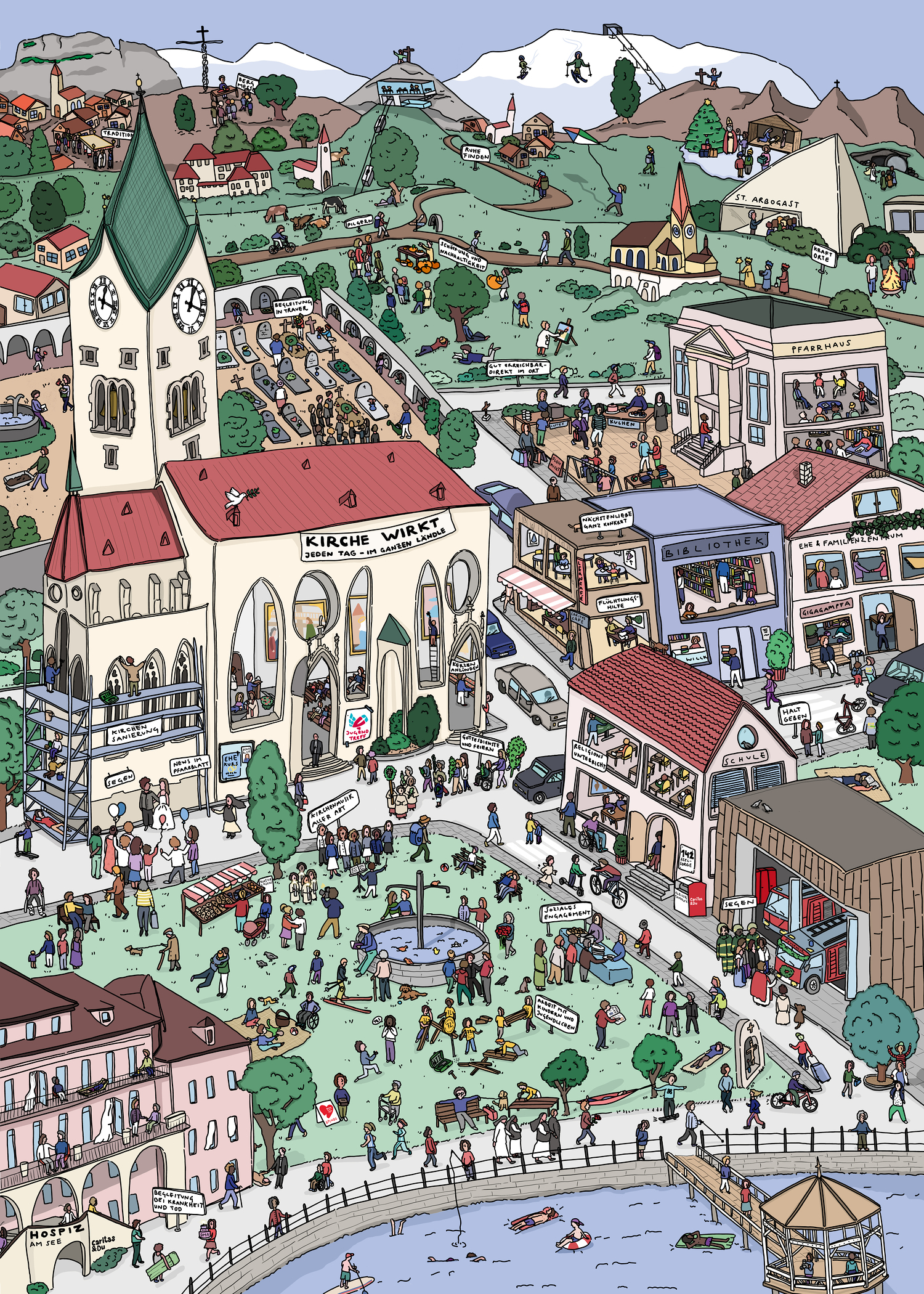 Im Wimmelbild - Leistung sehen Sie eine Vielzahl an kirchlichen Themenbereichen in Vorarlberg. Vom Hospiz am See bis hin zur Bergmesse in luftiger Höhe, von sakramentalen Feiern und Bräuchen bis Akuthilfe für Menschen in Not.